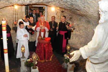 | PONTIFICAL COUNCIL FOR THE FAMILY VISIT TO THE GROTTO OF SAINT PAUL Rabat, Malta Saturday, 27 June 2009 Very Reverends Archpriest, Father Louis Suban, and Canons of the Collegiate Church of Saint Paul, Reverend Priests and Religious, Dear brothers and sisters in Christ, I wish to greet you with Saint Paul’s words: “Grace to you and peace from God our Father and the Lord Jesus Christ” (Rom 1:6). As the year dedicated to the great Apostle comes to its end, it is most fitting that, as Special Representative of His Holiness Pope Benedict the Sixteenth, I meet you for the first time, beloved people of Malta, here at Saint Paul’s Grotto in Rabat. With joy I bring you His Holiness’ apostolic prayerful wishes and blessing. A few moments ago, I had the privilege of descending into the Grotto, - a place venerated for many centuries and which the Knights of St John promoted as a place of pilgrimage. Like our beloved Pope John Paul II, I have been able to meditate at that site where Tradition says Saint Paul lived, just outside the walls of the chief city of Melita. How fitting it is that we gather where Paul celebrated the Eucharist with the first Christian community of Malta, and where he preached during his three months stay in this country. Dear people of Rabat and of this country, you are successors of Paul’s converts, my message to you is that you continue in their love and faithfulness to Christ’s Eucharist and Word. In the name of Jesus Christ: pay heed to God’s Word, especially as proclaimed on Sunday. Let it guide you in your decisions and inspire the life of your families. Devoutly participate in the Eucharist. In this way you will receive evermore Christ’s spirit and his love, enabling you to grow in ecclesial communion and in your love for God and neighbour, according to the teaching of Paul: “There is one bread, and so we, though many, are one single body, for we all share in the one bread” (1 Cor 10:17). I greet you with much affection, while bearing profound admiration for your historic faithfulness of the Gospel: may Almighty God bless you, the Father, the Son and the Holy Spirit!  Cardinal Antonelli in St Paul's Grotto  Cardinal Antonelli during a moment of prayer in St Paul's Grotto |