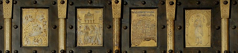1) La porta bizantina viene ordinata a Costantinopoli nel 1070 dal console amalfitano Pantaleone (per remissione dei suoi peccati, poiché questo mercante si è arricchito facendo commercio di schiavi musulmani e cristiani, traffico proibito dalla Chiesa). L’artista Teodoro rappresenta un ciclo cristologico, un ciclo apostolico (il Martirio degli Apostoli) ed un ciclo profetico. La porta è stata rimontata, ai giorni nostri, in controfacciata della Porta Santa. |