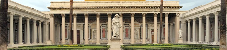 | El grandioso atrio de cuatro pórticos, con sus 70 metros de lago y sus 150 columnas, fue proyectado por Poletti y terminado por Calderini. En el centro destaca una estatua colosal de san Pablo, obra de Giuseppe Obici (1807-1878). La fachada está decorada con mosaicos realizados entre 1854 y 1874 (cartones de Agricola y Consoni) que representan: en el registro inferior, Isaías, Jeremías, Ezequiel y Daniel; en el registro del medio, el Cordero místico rodeado por cuatro ríos que simbolizan los cuatro Evangelios, y por doce corderos que representan los doce Apóstoles. En el registro superior, Cristo entre Pedro y Pablo. Las tres puertas. En el centro[1], la monumental Puerta de bronce verde de Antonio Maraini que fue colocada en 1931, y, a la derecha, la nueva Puerta Santa[2], de bronce dorado, obra del escultor Enrico Manfrini, fue colocada con ocasión del Jubileo del año 2000. Y La puerta bizantina que adorna la parte interior de la Puerta Santa.