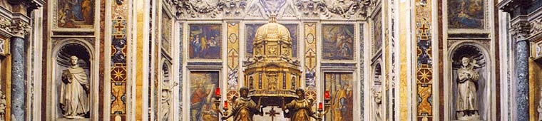 | Avant d'admirer une œuvre ainsi importante comme la Chapelle Sixtine il resulte nécessaire faire un petit tour de reconnaissance a celui qui a voulu l'édifier. Sixte V a été le Pape qui plus que ses predecesseurs avait su redonner vigueur à la ville dépaupérisée par le "sac" de Rome en 1527 et sa première préoccupation fut celle de redonner à la ville eternelle la possibilité de s'étendre en assainissant les zones malsaines et en créant une infrastructure utile à l'exploitation des aires déjà occupées par des nouvelles installations. A son architecte de confiance, Domenico Fontana, le pontife commanda donc de construire une chapelle digne du très Saint-Sacrement et de garder celle de la Crèche. Le programme iconographique de la décoration pittoresque, ou sont représentés les ancêtres du Christ, l'histoire de la Vierge et la vie de Jésus, se retrouve au centre dans la Chapelle de la Crèche sous l'autel en conservant l'ancien Oratoire de la Crèche, réalisé durant le XIII siècle par d'Arnolfo di Cambio, que Domenico Fontana transporta entieremment de l'abside de la Basilique. Les peintures de la Chapelle Sixtine célèbrent l'apothéose de la Vierge, la maternité divine toujour niée par l'héresie protestante, dans le Concile de Trento. L'entreprise fut dirigée par César Guerra et Jean Nebbia, c'est entre 1587 et 1589 qu'ils furent payés. Leur préoccupation principale fut que les figures de la Sixtine soient la naturelle continuité du message déjà exprimé avec les mosaïques de l'arc absidale. De façon stylistique les peintures de la Sixtine ont une prise ceratine sur l'observateur. Éliminé tout intellectualisme et toute excessive personalisation artistique, les images procèdent claires et reconnaissables, sans provoquer d'ultérieurs commentaires. Ils sont nombreux les artistes qui ont travaillè à la Cappelle Sixtine. Sixte V voulut placer sa tombe et celle de Saint Pie V, le pape qui le créât cardinal, dans la chapelle. Le monument funèbre de ce dérnier résulte être le plus ancien, dessiné par Fontana, mais la statue est l'œuvre de Leonardo Sarzana et Sixte V allait la voir personnellement dans l'atelier de l'artiste, en assistant par la suite à son édification en juin de l'an 1587. Par contre, Giovanni Antonio Paracca, nommé le Valsoldo, fut chargé de la statue représentante Sixte V qui répresente le Pontife à genoux avec le regard débonnaire vers la Chapelle et sur la Crêche de la Crypte. À remarquer le bel autel au centre de la chapelle: quatre anges en bronze doré de grandeur nature, œuvre de Sebastiano Torregiani, ils souteniennent le ciboire qui constitue le modèle de la chapelle même, richement décoré avec des anges et des prophètes le tout en rondeur avec les bas-reliefs sur les guichets, aux pieds de l'autel, placé sur un autel de style "cosmatesco" à la fin de la échelle double de l'Aveu qui mène à l'Oratoire de la Crèche, la nativité de Cecchino de Pietrasanta du XVI siècle. |